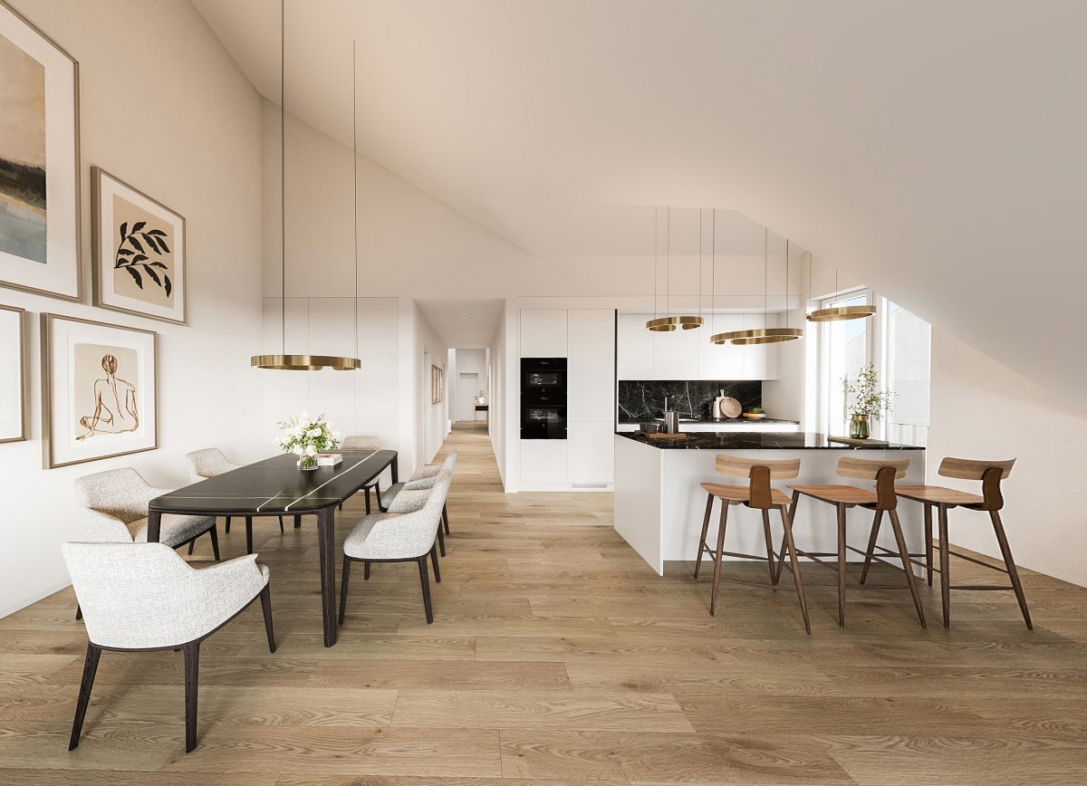 Die Wohnungen in der obersten Etage verbinden Eleganz mit Gemütlichkeit. Die hohen Räume und die Dachlukarnen verleihen dem attraktiven Zuhause eine besondere Atmosphäre. Die Wohnungen verfügen zudem über eine Loggia, von welcher man eine atemberaubende Weitsicht geniesst. Jetzt 3D-Tour entdecken!